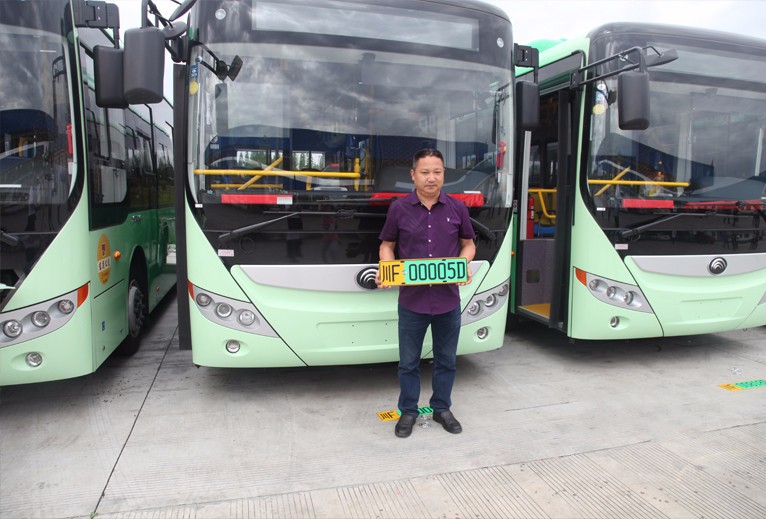 與小型新能源車不同的是,大型新能源汽車專用號牌底色采用黃綠雙拼色,前五位使用數(shù)字,第六位啟用字母,D代表純電動新能源汽車,F(xiàn)代表非純電動新能源汽車。新能源汽車號牌采用了新的防偽技術(shù)和制作工藝,含有防偽底紋暗記、二維碼、激光圖案等,號牌輪廓尺寸和普通汽車號牌也有不同。新能源車號牌與宏運(yùn)公交的純電動公交車身綠色圖案相呼應(yīng),凸顯了綠色、環(huán)保、科技的理念。