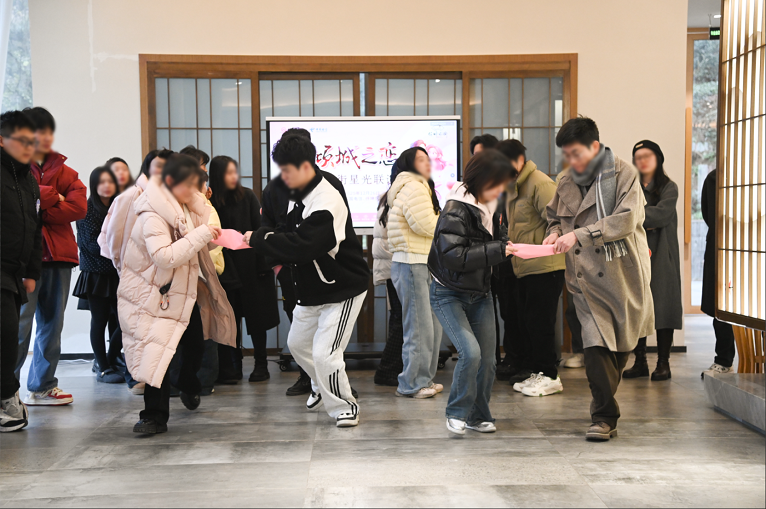 破冰環(huán)節(jié)成為拉近彼此距離的關(guān)鍵一步,青年們根據(jù)手中的號(hào)碼牌,尋找對(duì)應(yīng)的另一半,兩兩相對(duì)而坐,開啟了真誠(chéng)的自我介紹。簡(jiǎn)單的問候、真摯的分享,讓原本陌生的氛圍逐漸升溫,默契在不經(jīng)意間悄然滋生,為后續(xù)的互動(dòng)奠定了良好基礎(chǔ)。趣味十足的游戲環(huán)節(jié)更是將活動(dòng)氛圍推向高潮。“幸福接力” 游戲中,男女嘉賓協(xié)作配合,用 A4 紙小心翼翼地傳遞乒乓球,過程中既有緊張刺激的比拼,又有歡聲笑語的互動(dòng),大家在協(xié)作中增進(jìn)了解、加深信任;“聽曲識(shí)歌” 環(huán)節(jié),經(jīng)典旋律響起,青年們踴躍搶答,展現(xiàn)出豐富的音樂儲(chǔ)備,臺(tái)下掌聲與喝彩聲不斷;“你比我猜” 游戲則考驗(yàn)著搭檔間的默契,夸張的肢體動(dòng)作與巧妙的語言提示相映成趣,現(xiàn)場(chǎng)充滿了歡樂的氣息。一系列精心設(shè)計(jì)的游戲,讓青年們?cè)谳p松愉悅的氛圍中徹底放下拘謹(jǐn),盡情釋放活力,陌生感逐漸消散,情誼在互動(dòng)中悄然升溫。